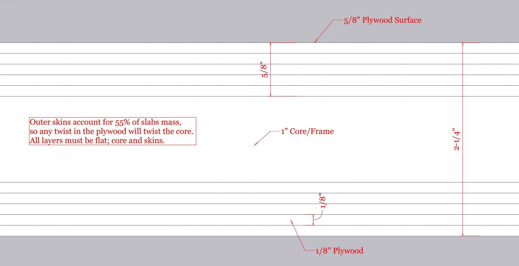 For “flush surface” doors, versus “frame and panel”, the outer surface or skins is typically Marine Grade Plywood laid over an insulated “core”. In the case of these “flush surface” doors where several layers are combined to achieve final thickness, the flatness of the outer plywood is critical in keeping the finished door assembly flat. Often, manufactured plywood is not truly flat, so we laminate our own plywood, typically from 1/8” sheets, to create 5/8” plywood, that is perfectly flat, and contains more glue lines, aiding in its rigidity.