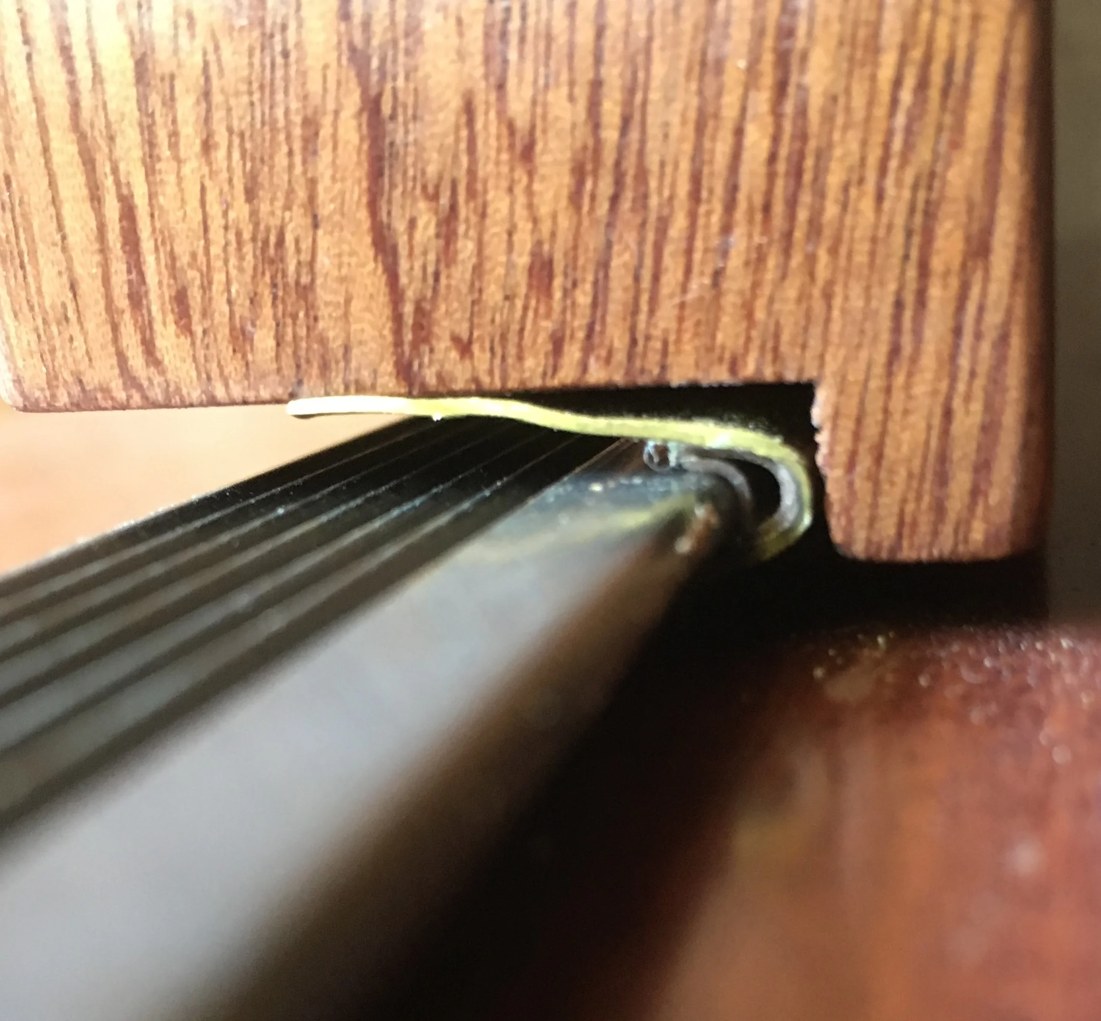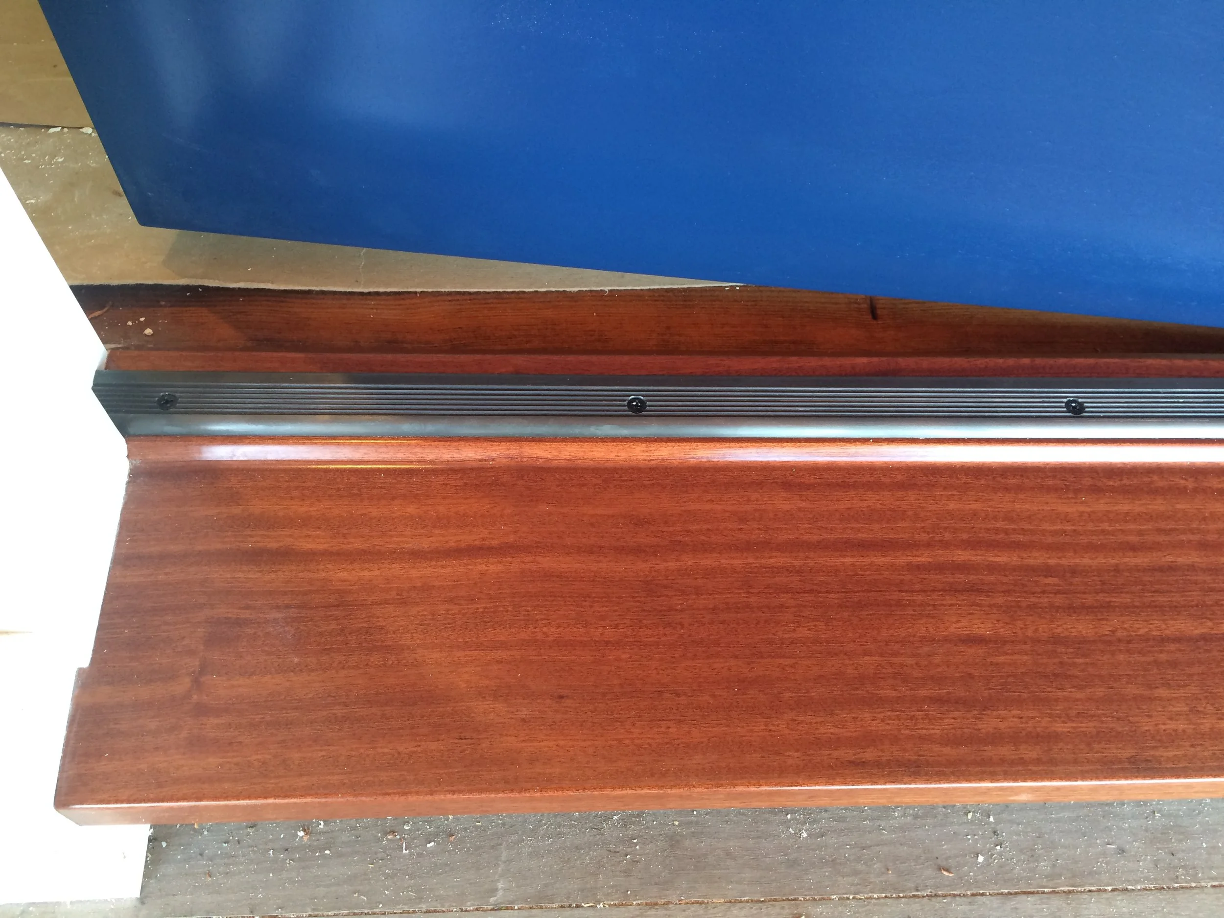 We prevent the passage of wind or water at the bottom of our slabs using interlocking components paired with an adjustable silicon flap seal. A "J-hook" is nailed into the bottom of the slab, which grabs onto a bronze saddle, as the door closes. The adjustable silicon flap seal sits next to the J-Hook for a second layer of seal.
